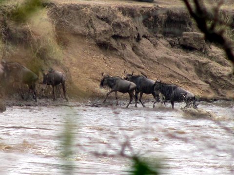 We got to the Serena crossing just in time, and we got to see the animals begin their crossing. It was truly exciting, for there didn’t seem to be any predators around, and we could see the wildebeests climbing out and making their way up the other side, to the rich grass that would sustain them well for two or three more months. It was an amazing experience and it, sadly, ended abruptly as two vans came into the area and, without knowing better, I suppose (I’m trying to be charitable) drove up to the herds waiting to cross. Of course they broke up and scattered in every direction, ending the crossing at that spot for the day.