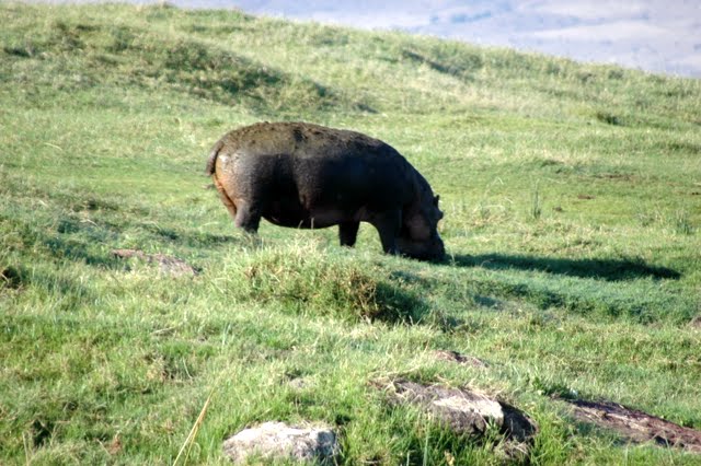 There were a number of hippos moving about on the crater floor, and one we spotted was pretty impressive. We were able to drive close enough to get to observe him and his habits pretty well, and he paid no attention to us in our van. He just kept feeding on the grass, and every once in a while he would walk about a bit, so all in all our experiences with the animals on our game drive were successful, and we came away feeling good about what we had been able to see.