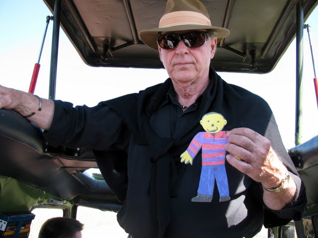 We also got to climb up Observation Hill, the only spot in the park where safari participants can get out of their vehicles, but we had a slight scare when we did that. Here’s a photo of me showing Stanley the climb up the hill, and as he was beginning to feel a little independent as we started up the hill, he decided to run on ahead of us. Not a good idea when you are only half-an-inch wide. The wind picked him up and just like when his brother and his friends were able to “fly” Stanley like a kite, he went whooshing up into the air. All of Stanley’s safari friends were called into action, running after him so he wouldn’t be blown out into the lower part of the dried lake, where the hippos (or rhinos – we couldn’t tell from where we were) were taking in the sun. Fortunately, we got to him, but we had to be a little stern with him, since Stanley has to stay with his friends if he doesn’t want to be blown away.